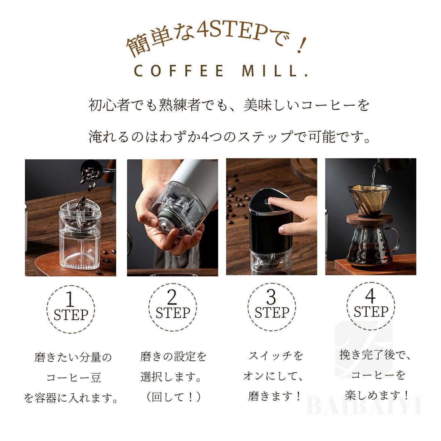 電動 コーヒーミル 臼式 コニカル式 ミニコーヒーグラインダー セラミック刃 コードレス 洗える 水洗い アウトドア 充電式 コンパクト 自動 珈琲 コーヒー豆 グラインダー 粗挽き 細挽き 粒度調整 自動停止 珈琲豆 プレゼント 電動コーヒーミル オフィスコーヒー